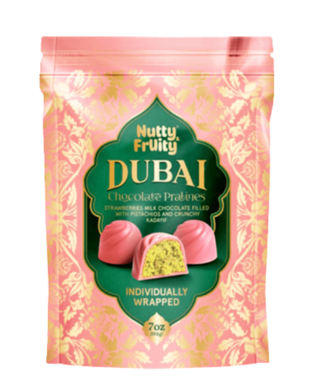 These individually wrapped treats are as beautiful as they are delicious! Pistachios and crunchy kadayif, a Middle Eastern and Turkish dessert made from fine, shredded phyllo dough, often layered with nuts like walnuts or pistachios, and soaked in a sweet syrup, is covered in strawberry infused milk chocolate. Other flavors include Dubai Chocolate Hazelnut Pralines and Dubai Angel Hair Milk Chocolate Bars.