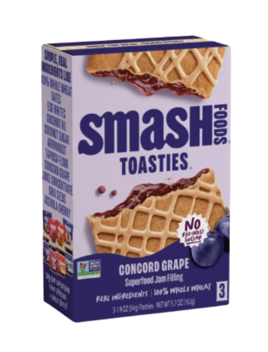 These superfood toaster pastries are made with 100% whole wheat flour, filled with Smash Foods signature concord grape, chia, and date jam, and drizzled with date frosting. Enjoy this delicious, satisfying treat made with quality whole food, non-GMO ingredients and no refined sugars. Other flavors include Strawberry Toasties and Blueberry Toasties.